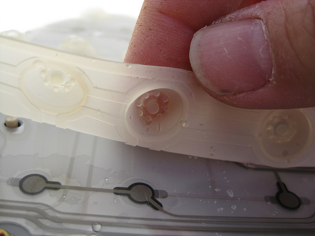 Kenyataannya hampir seluruh keyboard yang dijual bersama PC menggunakan karet pelapis di bawah setiap tuts-nya (seperti gambar diatas). Ini sama dengan teknologi yang digunakan pada remote TV yang murah itu lho. Produsen membuatnya semurah mungkin untuk memaksimalkan keuntungan. Ya, ini bahkan diterapkan pada keyboard “kelas atas”. Jadi kenapa kita terus-terusan menggunakan sesuatu yang dibuat semurah mungkin?