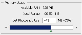 Photoshop mengkonsumsi banyak memori RAM untuk mendukung kinerjanya. Penggunaan RAM ini bisa kita atur di dalam Photoshop. Anda bisa merubah ukuran batas maksimal Photoshop dapat menggunakan jumlah kapasitas RAM yang tersedia. Untuk yang menggunakan RAM dengan jumlah kapasitas sampai dengan 2GB, coba ubah dengan menggunakan slider antara 55-65% dan untuk pengguna RAM 4GB bisa diatur sebesar 70-75%.